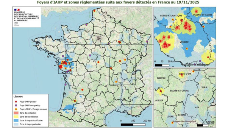 En Europe, 23 pays sont touchés par l’influenza aviaire. Entre août et début novembre, 236 foyers ont été détectés dans des élevages en Europe. En France, le niveau de risque d’influenza aviaire a été porté au niveau élevé depuis le 22 octobre 2025. Depuis août et en date du 12 novembre 2025 :